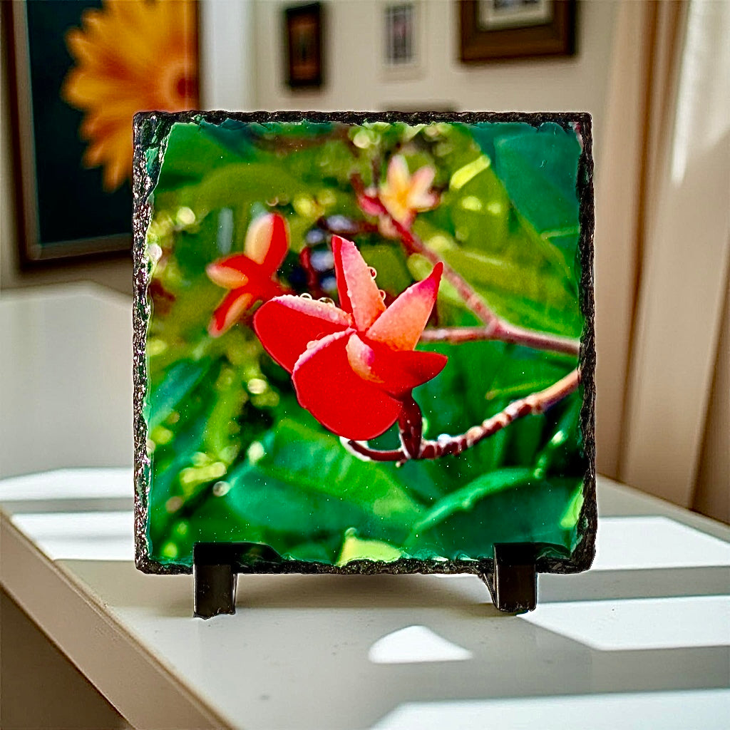 This joyous plumeria image reminds us of the beauty in simple things, like the delicate droplets of morning dew. Let it brighten up your morning routine and add a touch of whimsy to your space. (No need to be a morning person to enjoy it!)